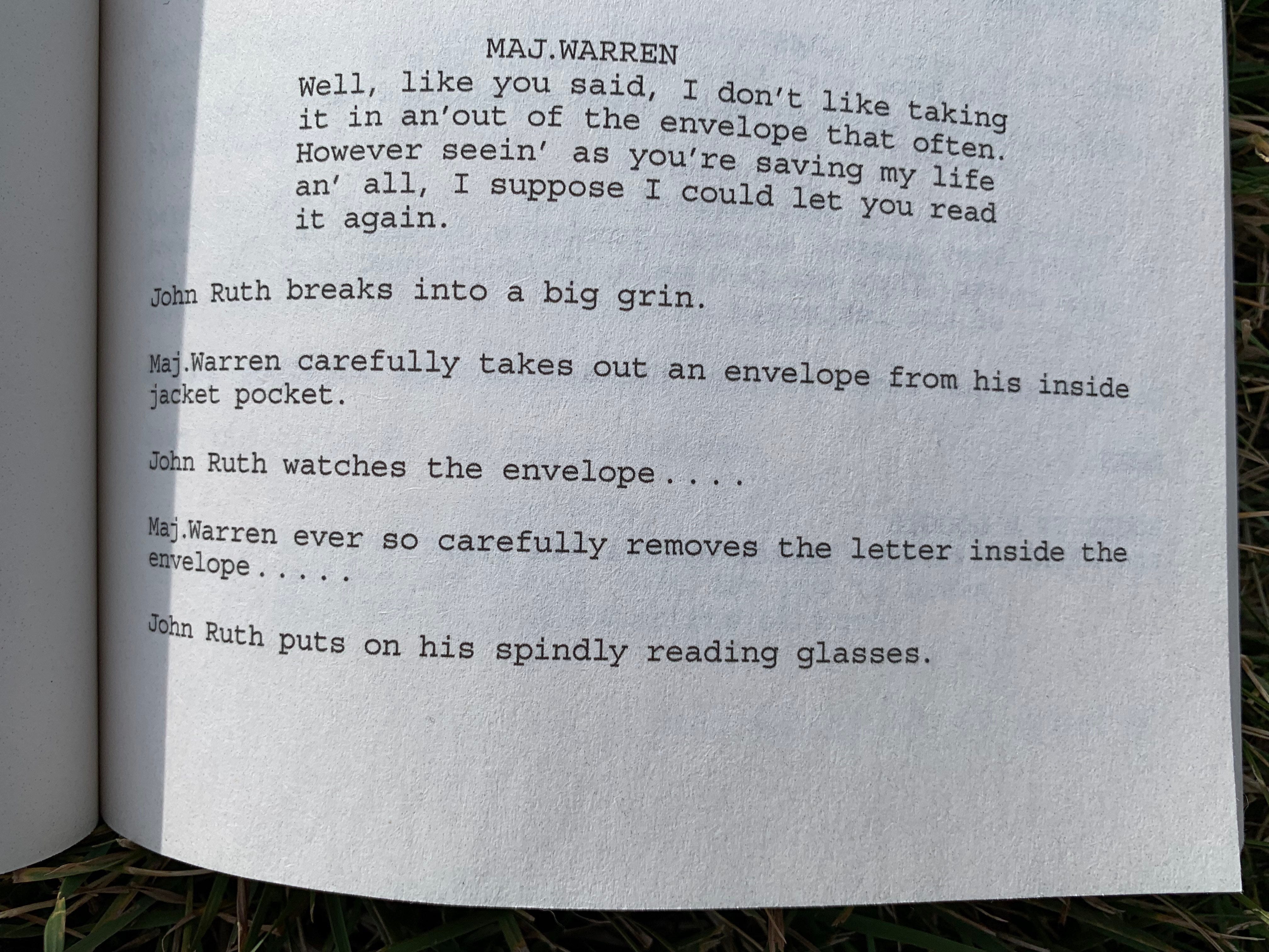 He even uses statements like (beat) to explicitly indicate that he wants a certain kind of pause (but not a long pause) between blocks of dialogue. This isn’t uncommon in screenplays, but it’s an interesting convention without much equivalent in prose.